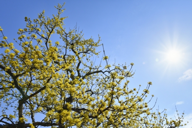 サンシュユは3月上旬には蕾が開花します。2〜3cmの小さな黄色い花が球体に集まり、枝全体を黄色く染め上げて、3月〜4月の時期を明るく彩ります。